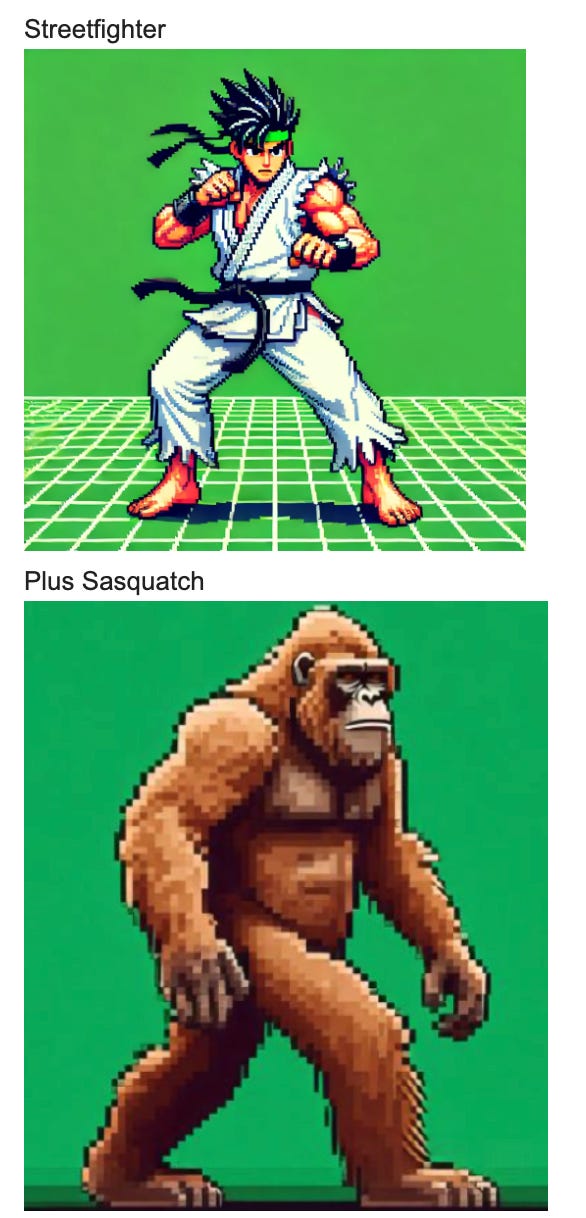 That I could “blend” characteristics of character traits together. So if I took Ryu from StreetFighter2 and blended him with the Sasquatch, I would get a Ryuatch.
