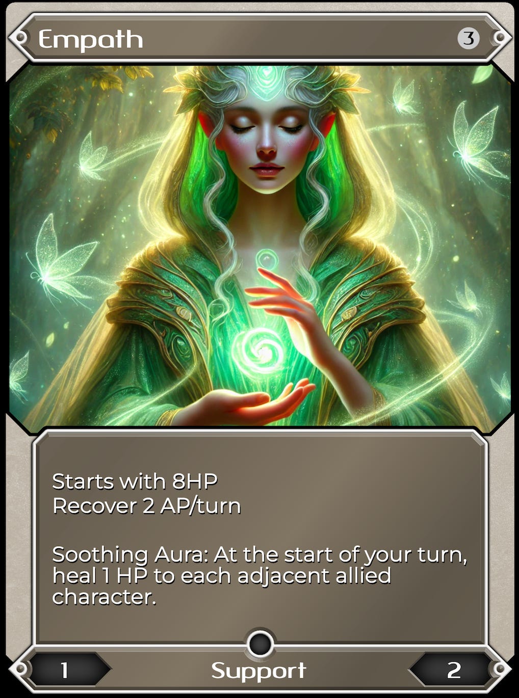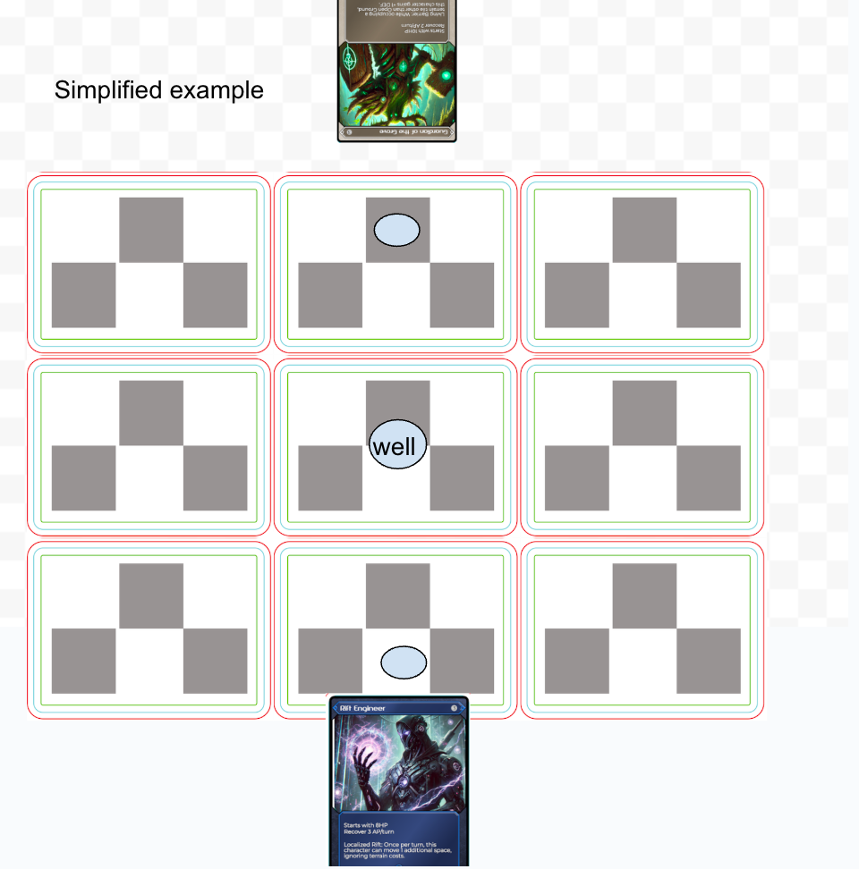Here is an extremely simplified example of GeneWeaver’s board layout with a hypothetical well right in the middle. The actual battlefield is larger than depicted, and the teams have ~4 characters on each side. There are also summoning stations, and “passives” on cards that give strategic advantages - players can choose which to go for first and build a strategy based on their deck’s strengths. Maybe one player will want to try to control a well and acquire resources over several turns while defending it. Or maybe they’ll avoid conflict and try to spawn a summon before engaging in combat to acquire a well. There are a lot of strategic options, and many ways that the game can be expanded to include new and interesting mechanics.
