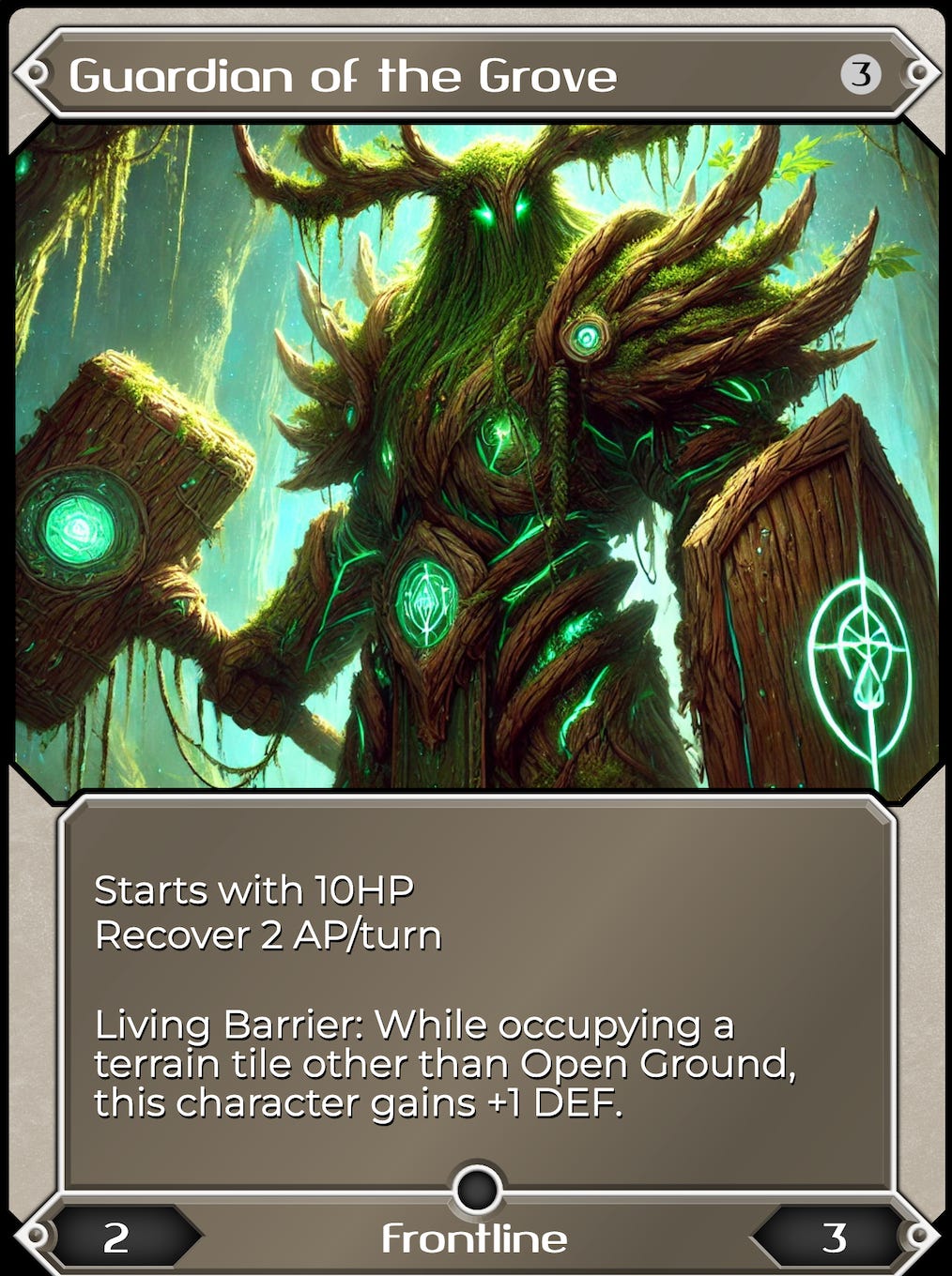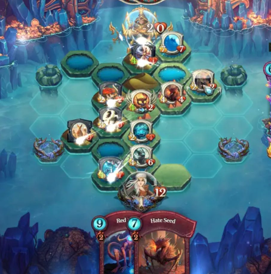 Abrakam’s Faeria is a really good example of a game that deals with this expertly. Players create the board tile by tile from the starting point, and you play cards to spawn creatures based on both how many “well” resources you’ve collected, as well as the number of tile types you’ve laid. So if you sit in the corner, your opponent will quickly “capture” the wells on the board that give you resources to play out powerful creatures. Similar to having a bunch of land and elves on the table early in MTG, if you can get resources early in the game, you’ll be able to play characters that are harder to take down and hit harder.
